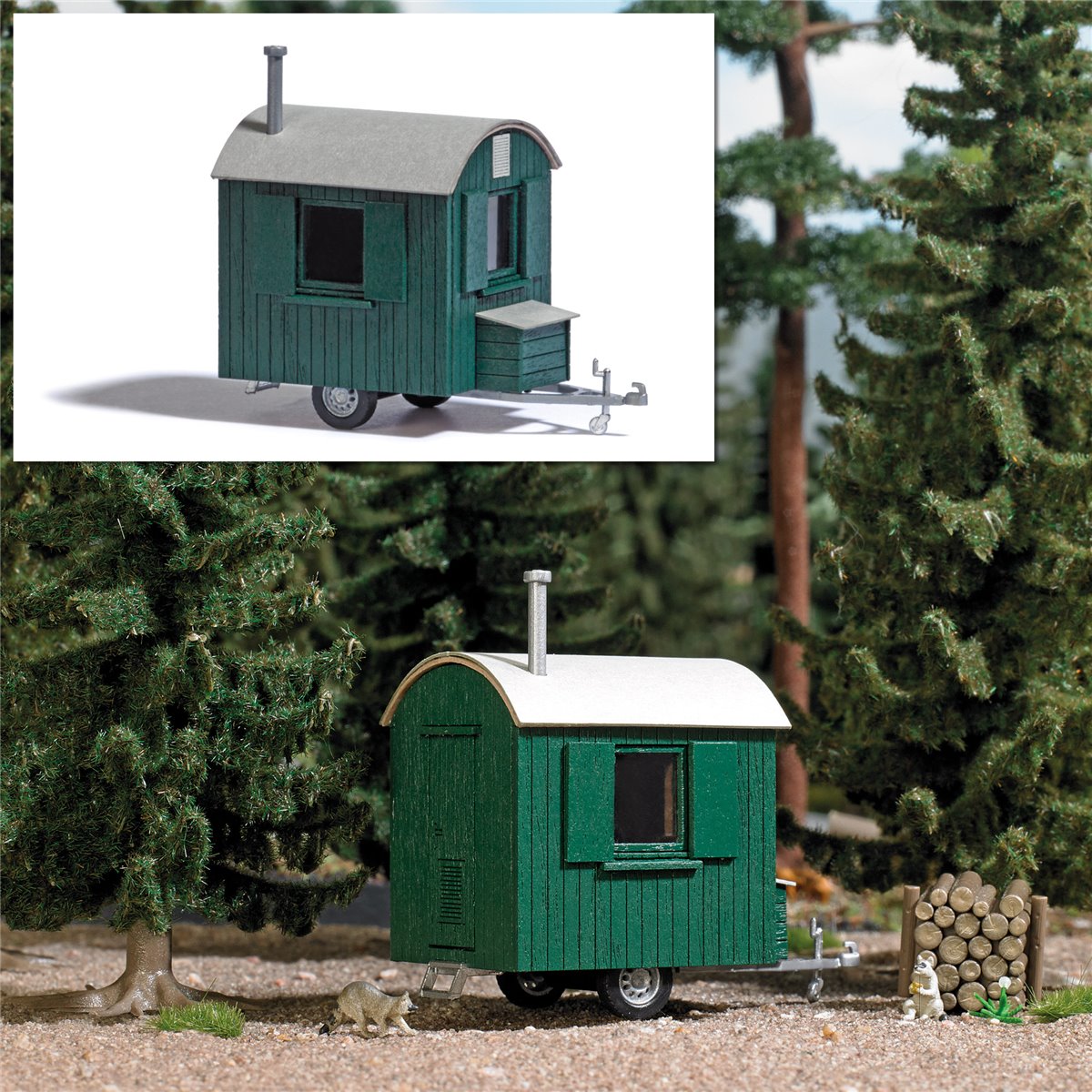 Bausatz für einen Anhänger als Forstwagen aus echtem Holz. Alle Teile fertig koloriert. Realistische Nachbildung des Tonnendaches mit Ofenrohr. Deichsel mit filigraner Anhängerkupplung. Größe: 49 x 27 mm Höhe: 40 mm.